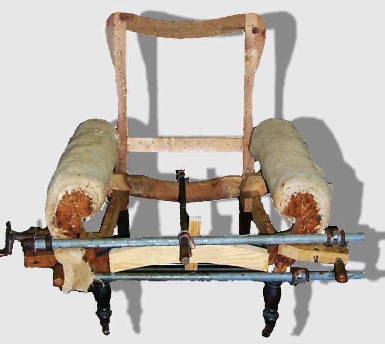 STEP TWO The second step is to reassemble the parts making sure that after clamping, the chair is squared and that all of the feet are touching the floor. In our shop we use freshly made hide glue making sure that the joints aren't tighten so much that it pushes out all the glue. The clamps are left on for at least 24 hours. Before we continue onto the next upholstery step we refinish the exposed wooden parts of the chair.