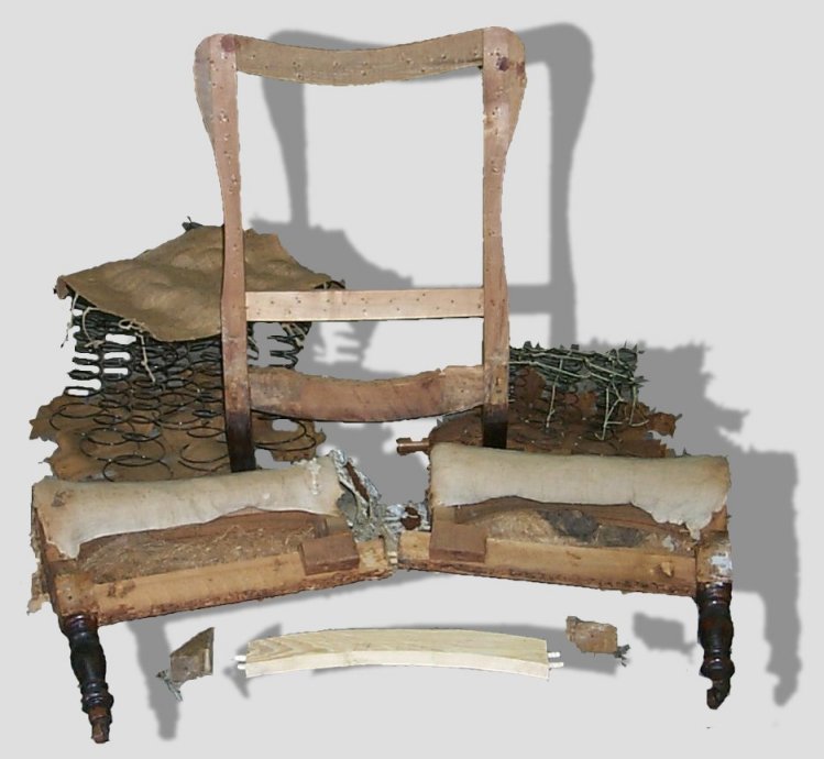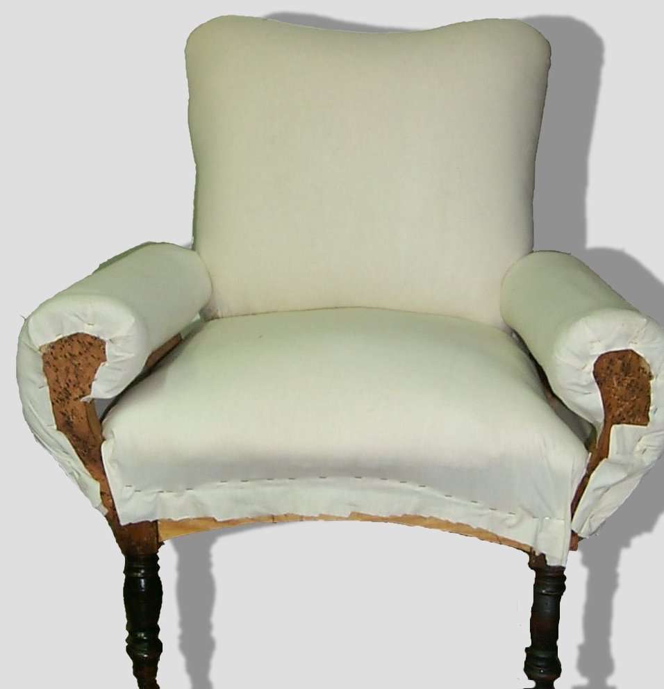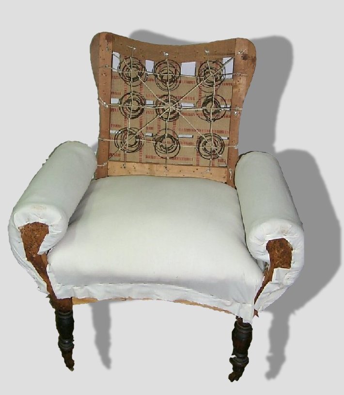 STEP FOUR The fourth step is to cover the springs with burlap and tack it down to the frame. This is covered with a layer of cotton batting, a layer of kinked horse hair and then another layer of cotton batting. This entire bundle is covered with muslin cloth to hold everything firm and in place. In our sample picture the arms are also padded and upholstered.