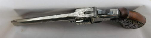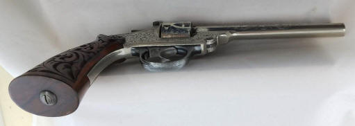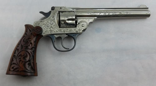 ENGRAVED IVER JOHNSON 22 CAL. REVOLVER. TOP BREAK 5 SHOT DOUBLE ACTION. "IVER JOHNSON ARMS & CYCLE WORKS, FITCHBURG, MASS. USA" MARKED ON TOP OF BARREL. BEAUTIFULLY CARVED WOOD GRIPS |